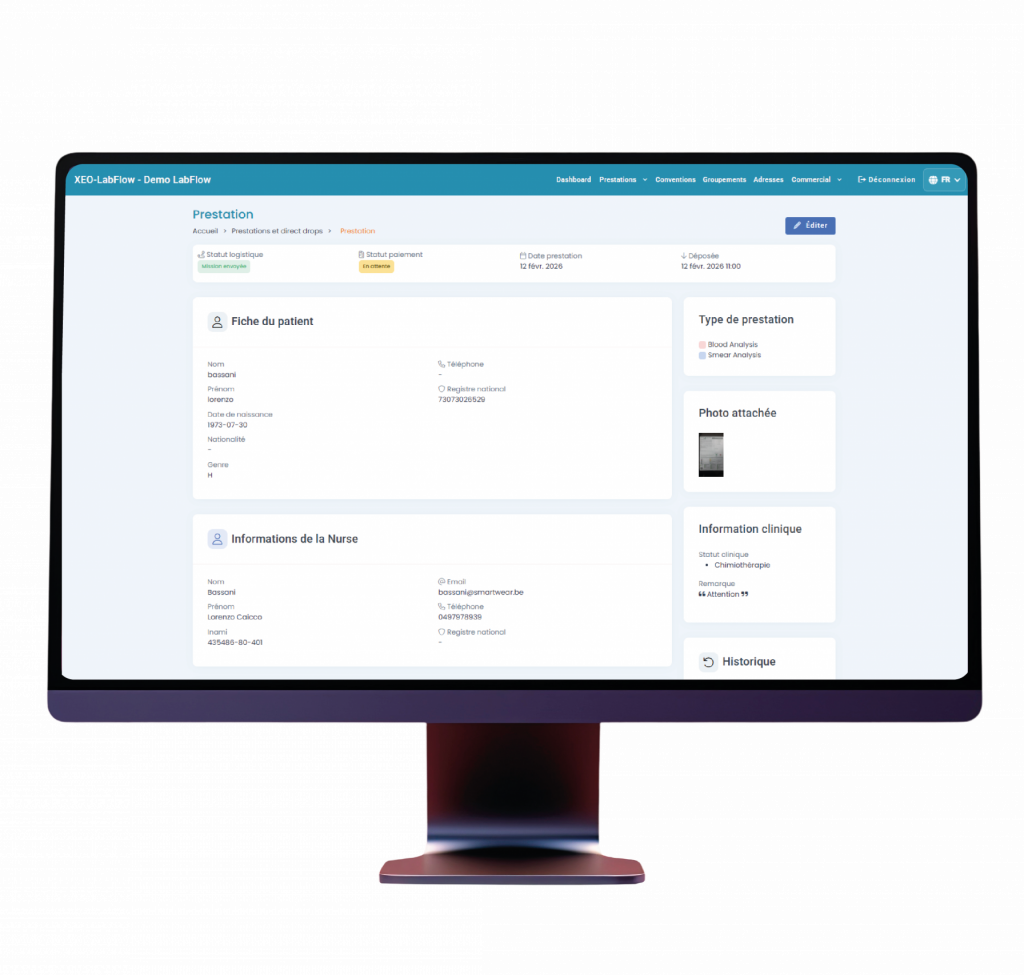 Une plateforme web Xeo-Labflow dédiées pour les laboratoires privés et publics afin de suivre le prélèvements depuis la nurse au laboratoire